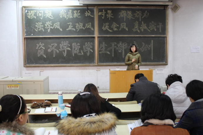 为提高学生干部思考问题、解决问题的能力,改变学生消极被动的行为模式,为了响应学院“强学风,正班风,促舍风”的号召, 2月23号上午在教学楼B102资环学院举行2014年学生干部培训,资环学院正科级辅导员刘春玲老师,辅导员徐良老师出席了此次培训。