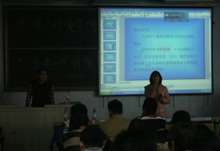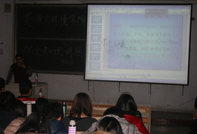 为增强大学生防范意识,提高防范能力,12月8日下午,资源与环境学院学工办在教学区B401举行安全知识讲座,学校保卫处治安科程致远老师应邀为11、12、13级各班班委及舍长做安全知识报告,正科级辅导员刘春玲老师参加了讲座。