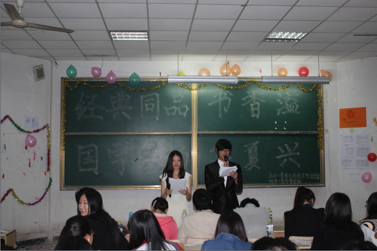 为弘扬国学精粹,创造和谐的校园文化氛围,丰富同学们的课余文化生活,4月27日下午,资源与环境学院在教学区D201举办了“经典同品书香溢,国学共扬华夏兴”国学知识竞赛。资环学院学生会主席王秀超及各部长参加活动并担任评委。
