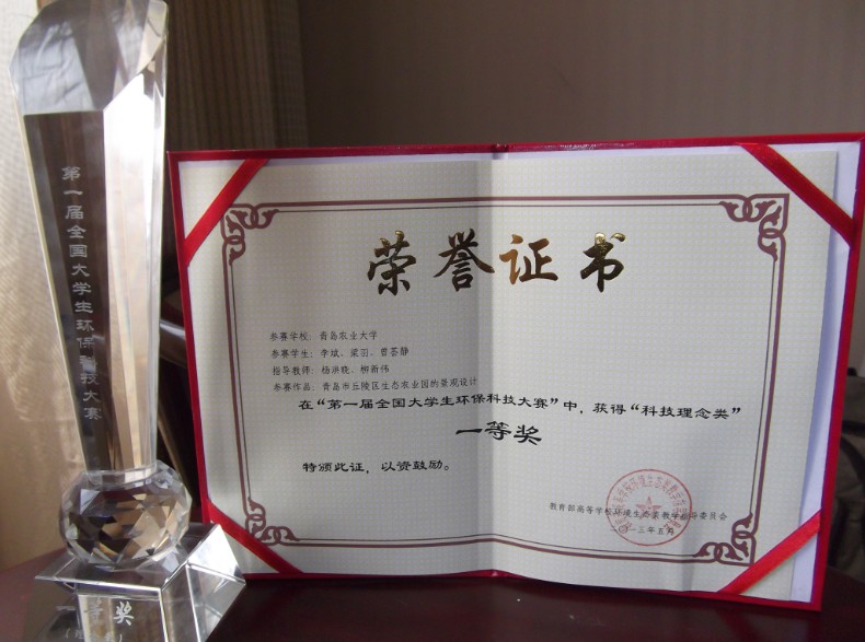 5月30日,首届全国大学生环保科技大赛在总决赛在北京林业大学举行。青岛农业大学资源与环境学院杨洪晓、柳新伟老师指导,生态学2011级学生李斌、梁羽、曾荟静完成的作品“青岛市丘陵区生态农业园的景观设计”获得“科技理念类一等奖”。