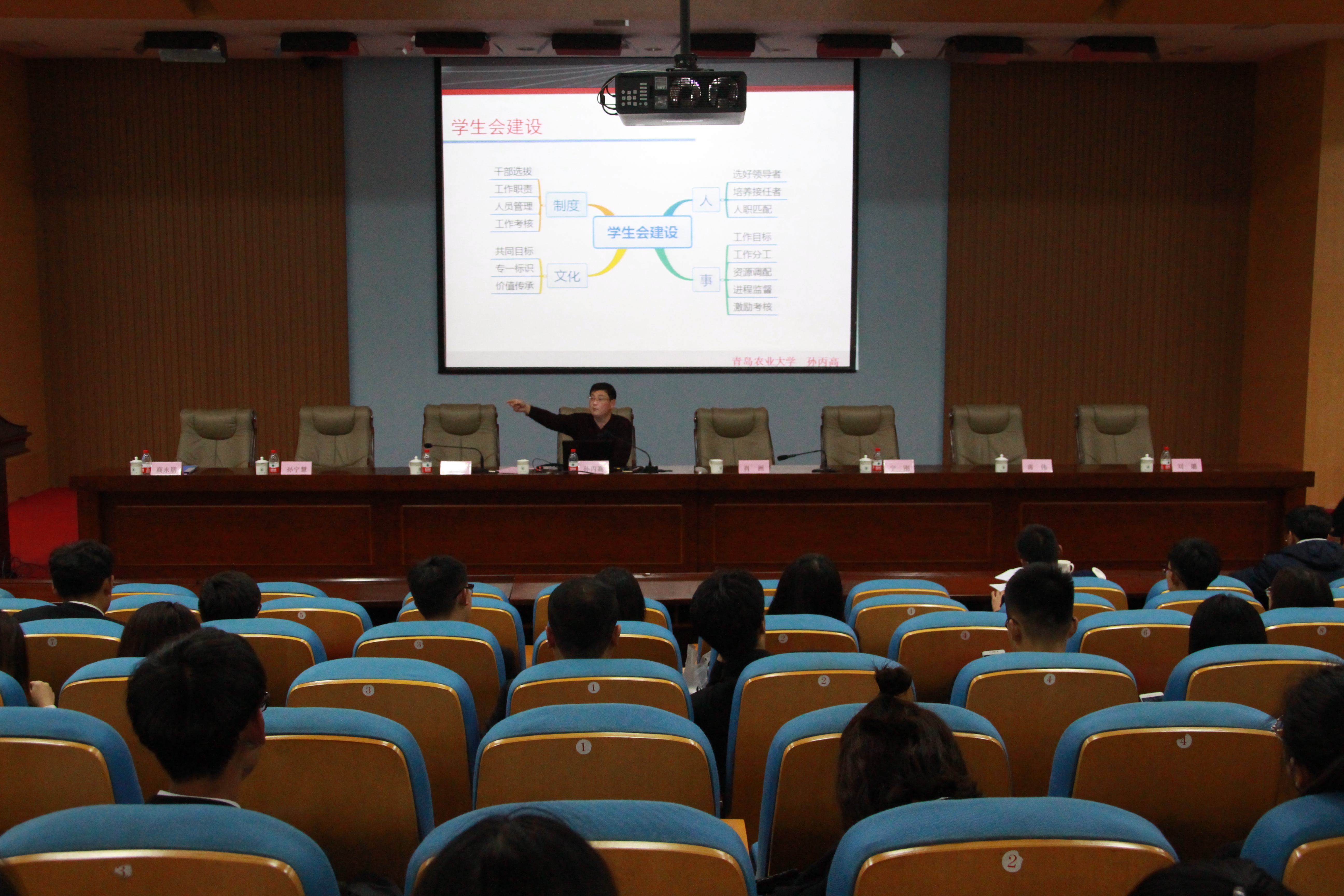 11月7日,青岛农业大学资源与环境学院党委书记孙丙高在学术会馆第三报告厅为全体学生干部开展主题为“高效能团队建设”的讲座,讲座由团委书记肖洲主持。