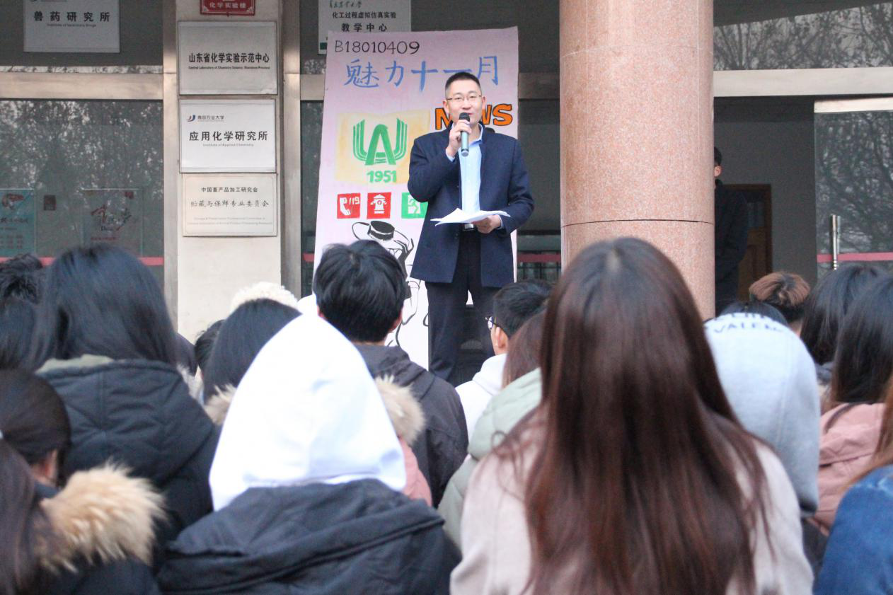 12月17日,青岛农业大学资源与环境学院在化学楼前召开期末考试动员大会,2016-2018级全体学生参加,学院团委书记肖洲主持会议。