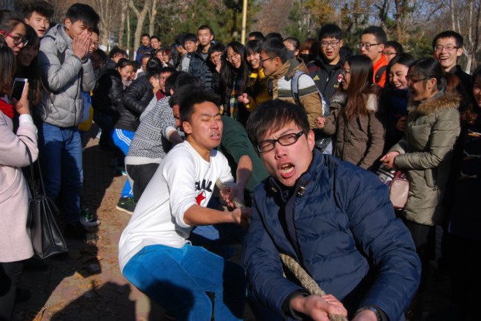 为丰富大学生校园文化生活,增进班级凝聚力,12月16日中午,资源与环境学院在化学楼前举行“凝心聚力”拔河比赛。资源与环境学院团委书记李永青、辅导员安俊庭到现场观看比赛。
