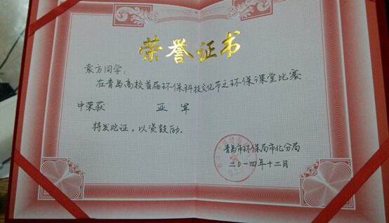 此次比赛以提高环保意识,宣传环保知识为目的,我院积极参加高校环保宣讲比赛意义深渊,极大的促进了青岛各个高校之间的学习交流,加深了学生对所学专业知识的理解,同时培养了同学们的荣誉意识及团队协作能力,是我院学风建设的成功范例。