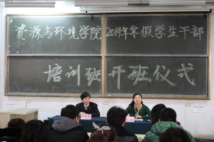为进一步加强学生干部培养工作,规范学生干部的言行,培养学生责任心,提高学生干部综合素质,促进学生工作全面发展,提高学院学生工作效率。 2月22日,资环学院学生干部培训班开班仪式在教学区B102隆重拉开帷幕,资环学院全体学生干部参加了此次干部培训。本次典礼由资环学院副院长、党委副书记林英老师主持召开,资环学院党委书记郭德明教授,正科级辅导员刘春玲老师出席参加了此次开班仪式。