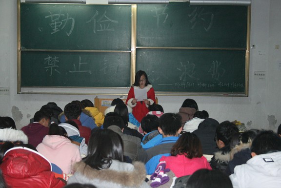 为了进一步贯彻学习近平总书记关于厉行勤俭节约、反对铺张浪费的重要批示精神,大力弘扬中华民族勤俭节约的优良传统,引导广大师生树立节约意识。2013年12月1日晚,资源与环境学院各班级均召开了“倡导节约、反对浪费”主题班会。主题班会旨在让同学们了解身边的铺张浪费行为,并能从自己做起,养成勤俭节约的好习惯。