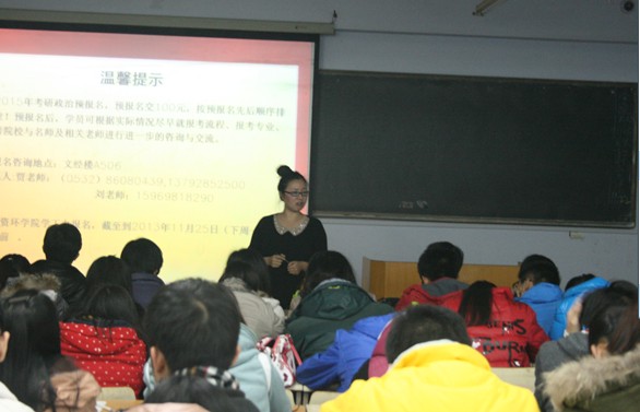 此次会议邀请了青岛农业大学人文学院的对考研有丰富经验的老师近十名,老师们就研究生与公务员考试的相关事宜,为资环学子做了详尽的解答。老师们以研究生与公务员考试的实际情况为引线,从如何准备、如何答题、如何面试几个方面为同学们详细讲解了研究生与公务员考试的有关事宜。在准备考试时,一方面要找对复习资料,有计划、有目的地复习;另一方面,要及时了解所选院校的有关考试的最新动态,及时调整自己的复习计划。在笔试时,一定要注意把握好时间,在题量很大的情况下要有选择性的做。在面试时,心态很重要,一定要有自信,注意礼貌和小细节,另外,可适当与考官进行眼神交流。老师们从实际出发,让同学们对研究生、公务员考试有了深层次的理解。