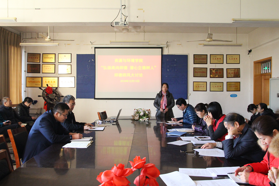 12月13日,青岛农业大学资源与环境学院于化学楼会议室开展“弘扬高尚师德,潜心立德树人”师德师风大讨论。学院全体教职工参加,学院党委书记史越清主持会议。