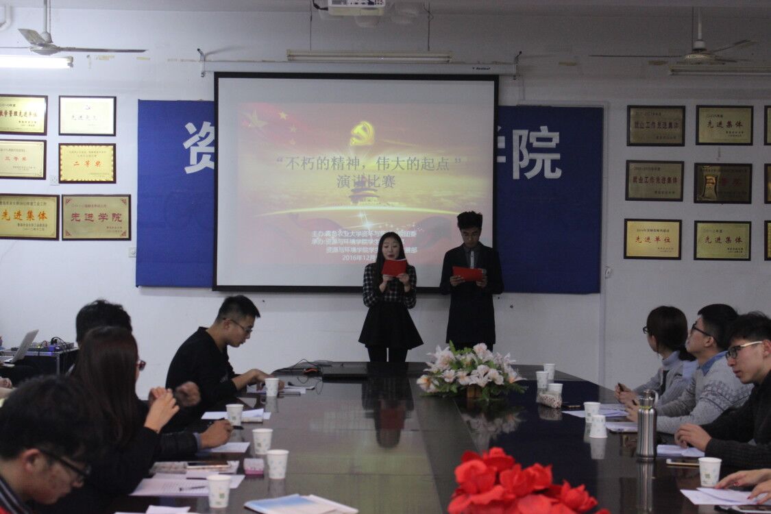 12月9日,资源与环境学院“纪念‘一二.九不朽的精神,伟大的起点”演讲比赛在化学楼会议室423成功举行。经过初赛激烈的角逐,最后有19位选手进入决赛。本次比赛由资环学院学生会各部部长担任评委。