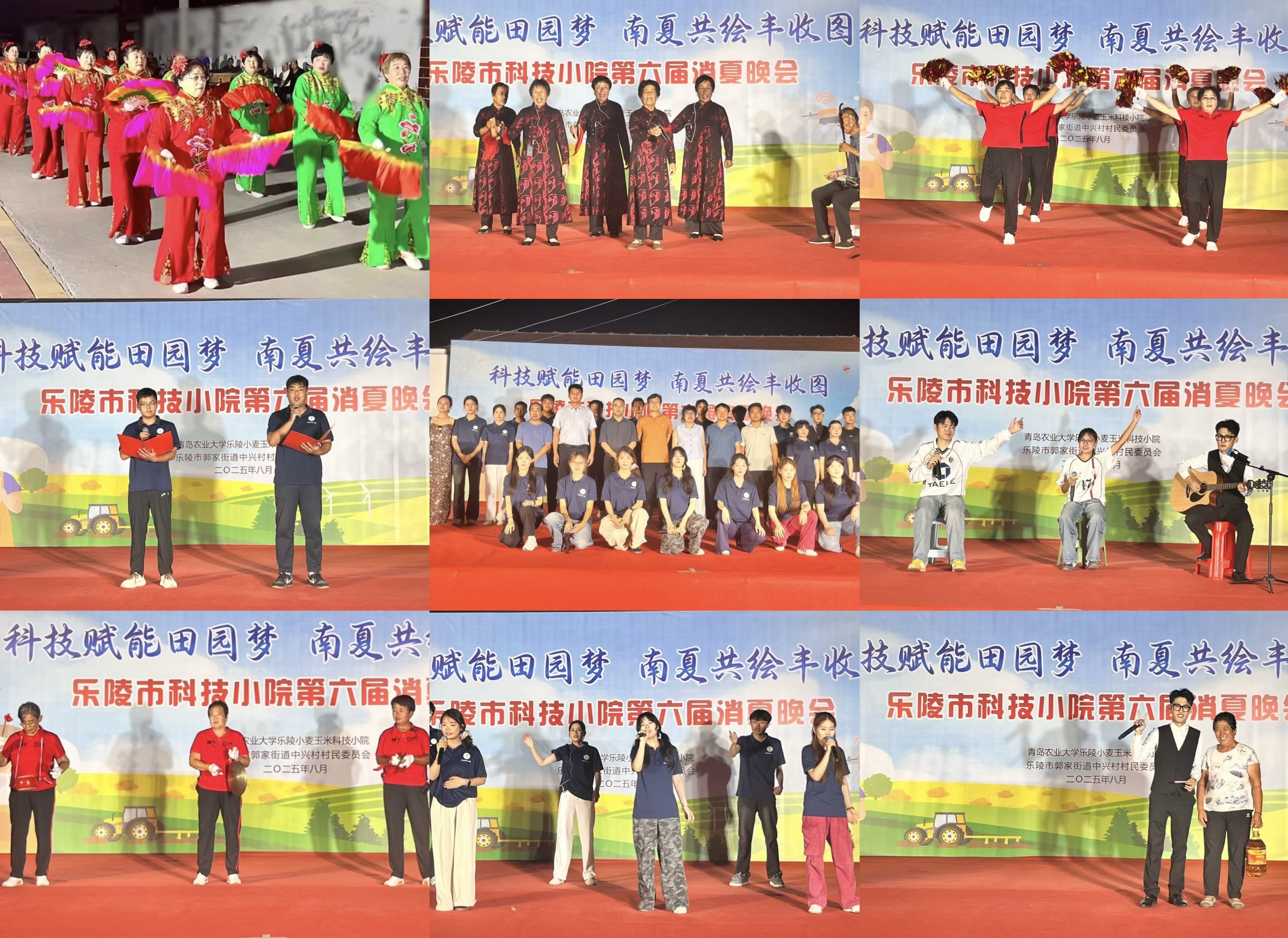 8月25日,全国科普月暨中国农民丰收节·乡村振兴齐鲁讲堂特别活动——科技小院文艺汇演(乐陵市科技小院第六届消夏晚会)在山东省乐陵市郭家街道南夏村成功举办。本次活动以“科技赋能田园梦,南夏共绘丰收图”为主题,充分融合农业科技推广知识与乡村文化振兴元素,为村民们带来了一场夏日文化盛宴。出席活动的嘉宾有中国农业大学国家农业绿色发展研究院副院长、资源与环境学院教授侯勇,中国农业大学资源与环境学院副教授安志超,乐陵市农业农村局党组书记、局长郑同彬,乐陵市农业农村局正高级农业推广研究员梁军,乐陵市郭家街道党工委书记石磊,党工委副书记、办事处主任郑圣杰,青岛农业大学资源与环境学院陈延玲教授、李赟副教授。青岛农业大学与中国农业大学驻乐陵市科技小院的研究生及广大村民共同参加了晚会表演。本次晚会通过“中国农技协”“山东农技协”微信视频号和抖音平台同步面向全国直播,得到网民与社会的广泛关注。
