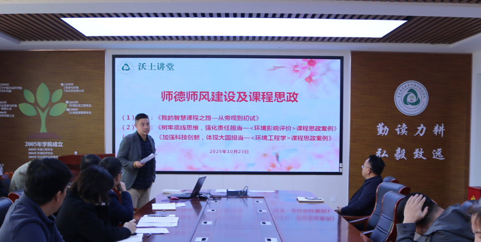 10月23日,资源与环境学院在化学楼423会议室举办“沃土讲堂”师德师风建设及课程思政研讨会。学院教师周克、吴娟、徐良分别进行了交流分享,学院全体教职工参会。